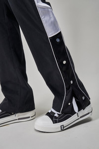 - elasticated waist with drawstrings - side two-tone trackstripe with buttoned cuff Materials: 98% cotton, 2% elastane Color: black white Made in United SKU: 139150 Brand style: SS23-W9-P14-112 Size and Fit Giel wears a size 30. Giel is 1.88m and normally wears a size Medium in tops, a size 48 in bottoms, and a size 30 in denim.