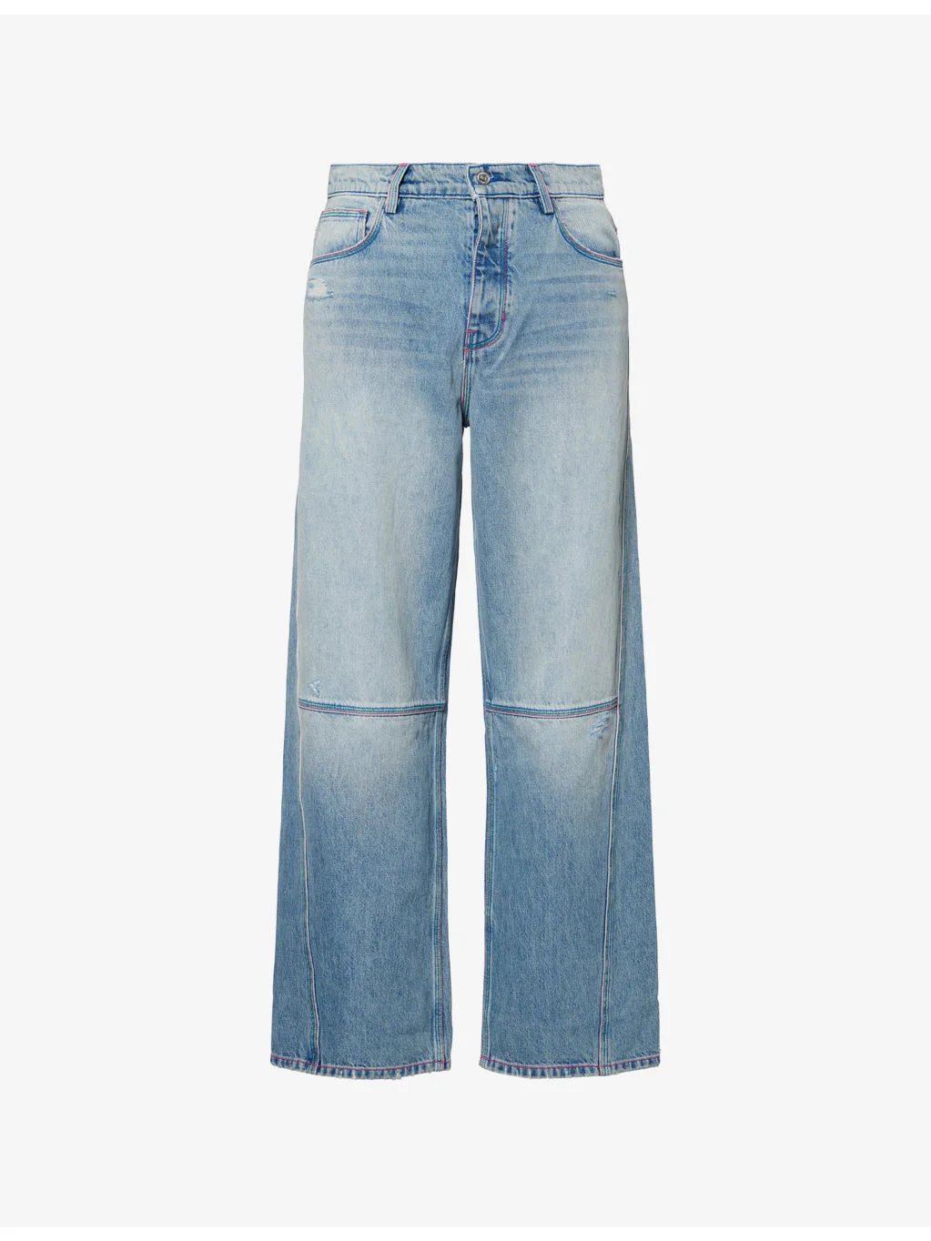 PRODUCT DETAILS - Nahmias denim jeans - 100% cotton - Button and button-fly fastening - Regular fit, wide straight leg, mid rise, belt loops, five pockets, contrast topstitch at seams, distressed denim - Dry clean - Made in USA - Size 30: rise 13in / 34cm, inside leg 33in / 84cm, leg opening 20in / 51cm - Model is 6ft 2in/1.88m and wears a size UK 30 - Midweight, non-stretch Ref: R04605249