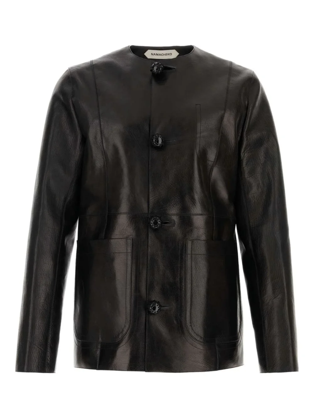 crew-neck leather jacket Highlights - Black - Front button fastening - Two front patch pockets - Long sleeves - Straight hem Imported Composition Outer: Calf Leather 100% Lining: Viscose 100%