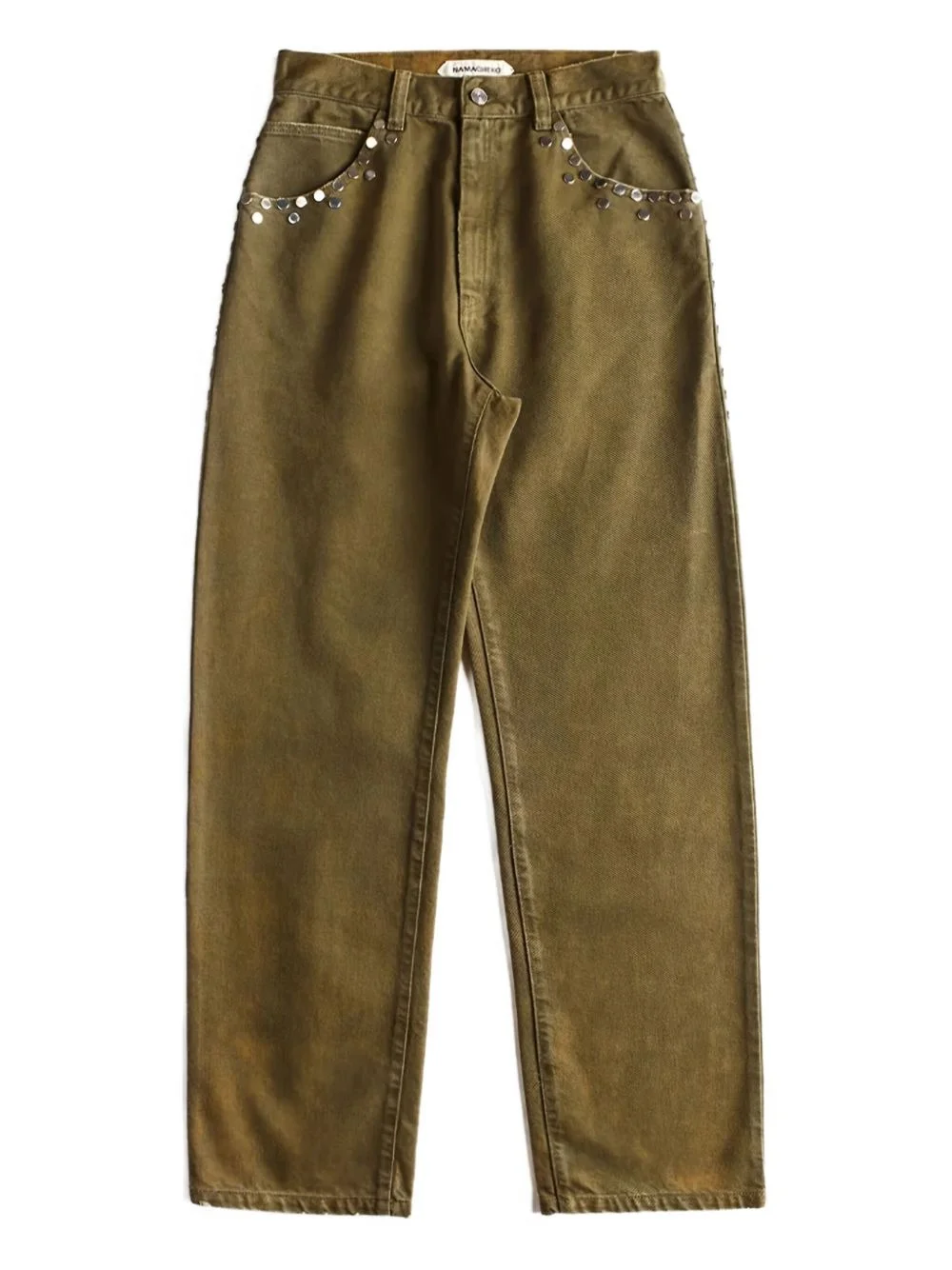 studded detail jeans Highlights - Olive green - Stud embellishment - Faded wash - Five-pocket design - Button fly - Straight leg Imported Composition Cotton 100% Washing instructions Read Manufacturer Guidelines