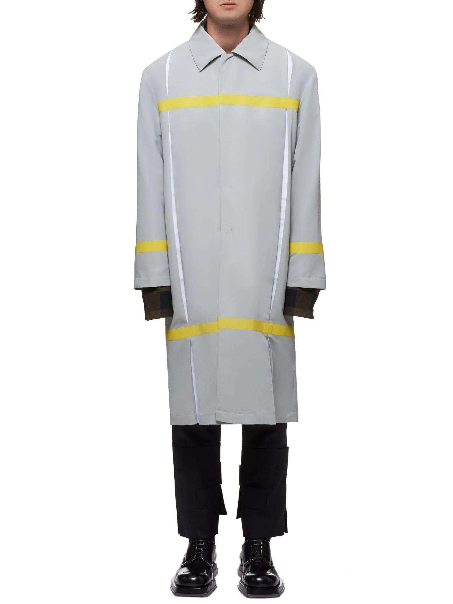 Namacheko lab coat in gray/yellow, spread collar, concealed front button placket, straight/finished hem, tonal stitching. Made in Belgium. Composition - 100% Polyester Model is 6ft and wearing a size S. Shoulders: 18” Chest: 35” Waist: 28”