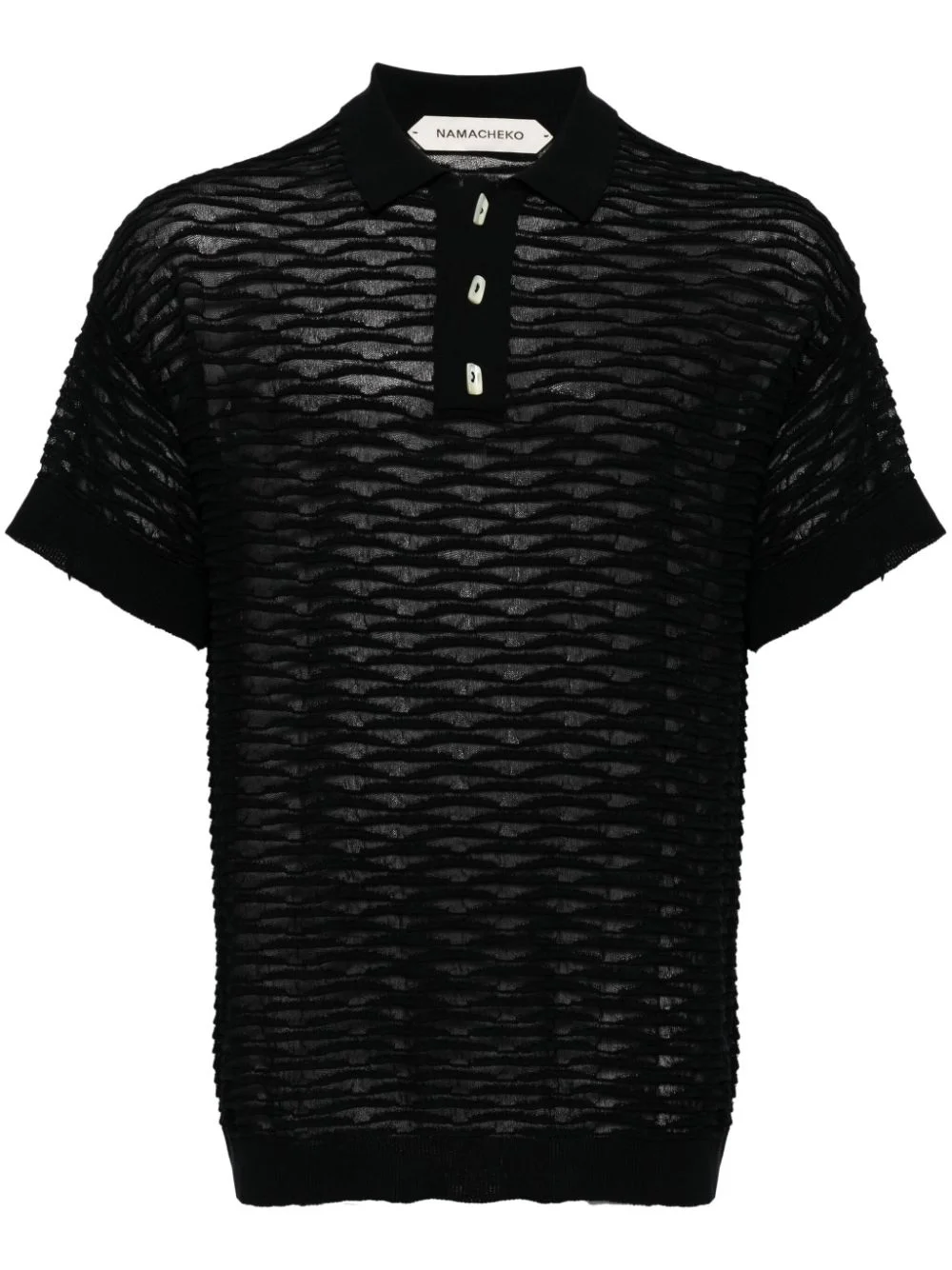 textured finish sheer polo shirt Highlights - Black - Cotton blend - Semi-sheer construction - Textured finish - Polo collar - Front button placket - Drop shoulder - Short sleeves - Ribbed cuffs and hem Imported Composition Cotton 90%, Polyamide 10% SIZE & FIT Model measurements Height 6 ft 2 in(1.87 m) Bust/Chest 33.07 in(84 cm) Hips 35.43 in(90 cm) Waist 26.77 in(68 cm) FittingInformation Designed for a regular fit, this polo shirt offers a comfortable loose fit throughout the body Made with a midweight knit, this piece offers some stretch This piece fits true to size – take your usual size