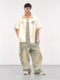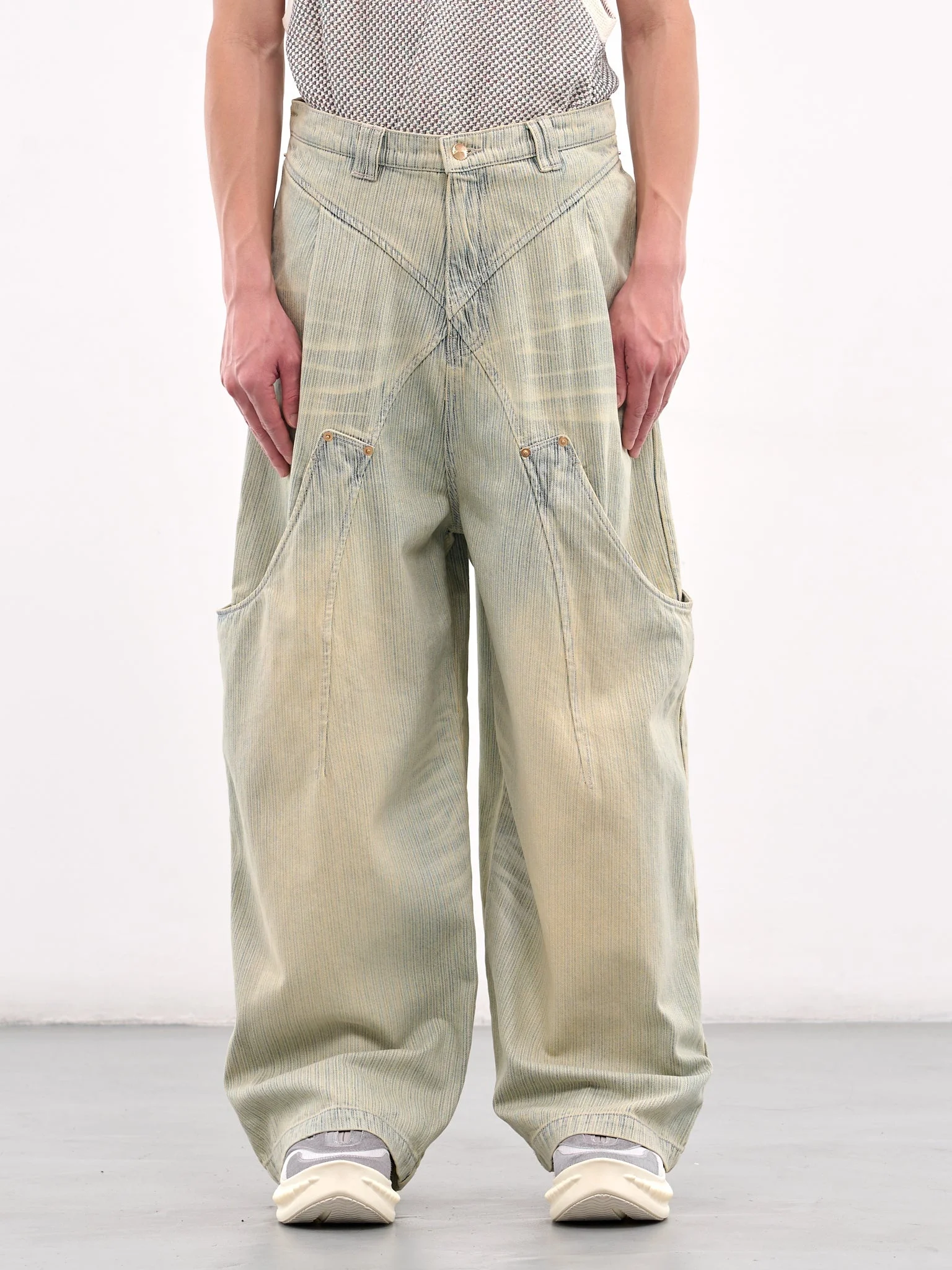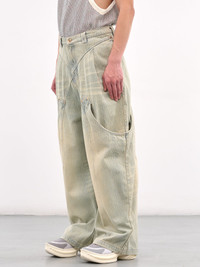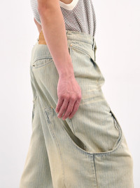 NAMESAKE jeans in blue, paneled denim construction, faded & whiskering, stripe pattern, double belt loops, back logo patch, front button & concealed zip fly closure, side pockets, back signature welt pockets, knee reinforced paneling & side pockets, wide leg, loose fit. Standard Sizing Model is 6'1" wearing size M. Shoulders: 18" Chest: 36" Waist: 30"