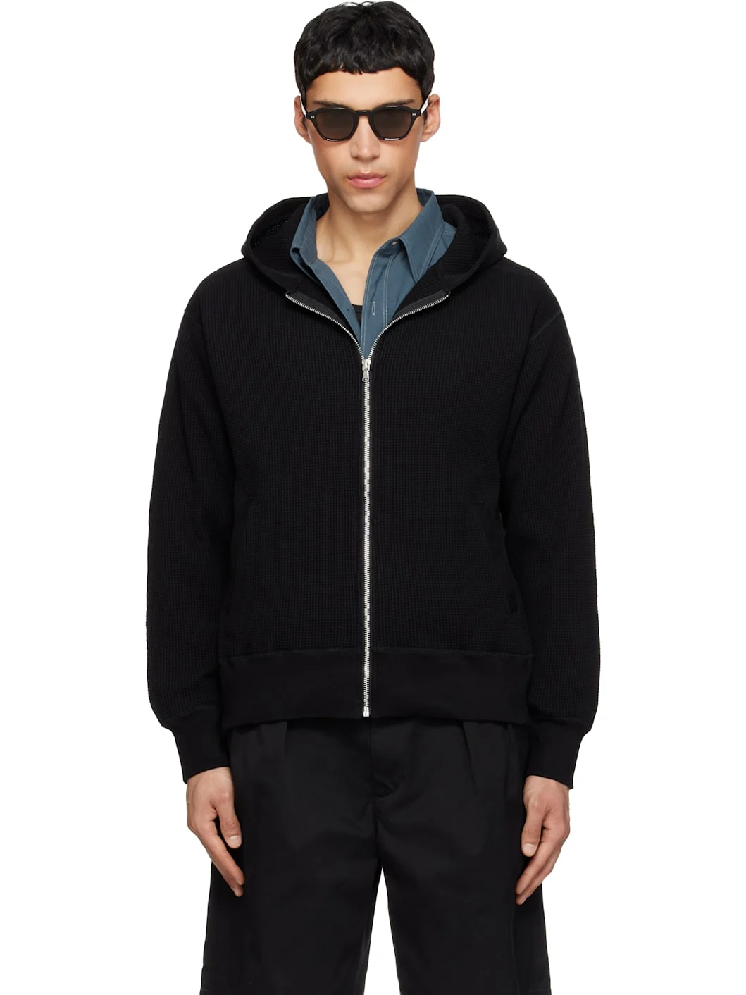 Waffle-knit cotton-blend hoodie. · Zip closure · Welt pockets at front · Rib-knit hem and cuffs · Saddle shoulders Supplier color: Black 70% cotton, 30% polyester. Made in Japan 261467M202000