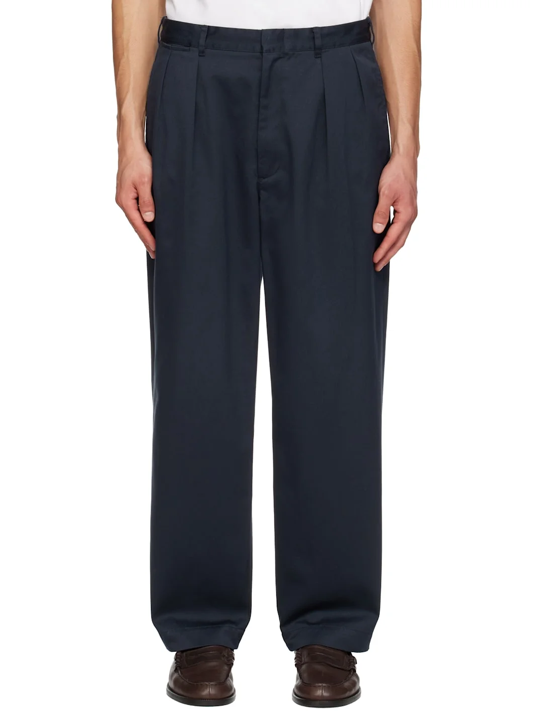 Cotton-blend twill trousers. · Lightweight and quick-drying · Wide, tapered-leg · Belt loops · Five-pocket styling · Zip fly · Pleats at front Supplier color: Navy 65% cotton, 35% polyester. Made in Japan 261467M191003