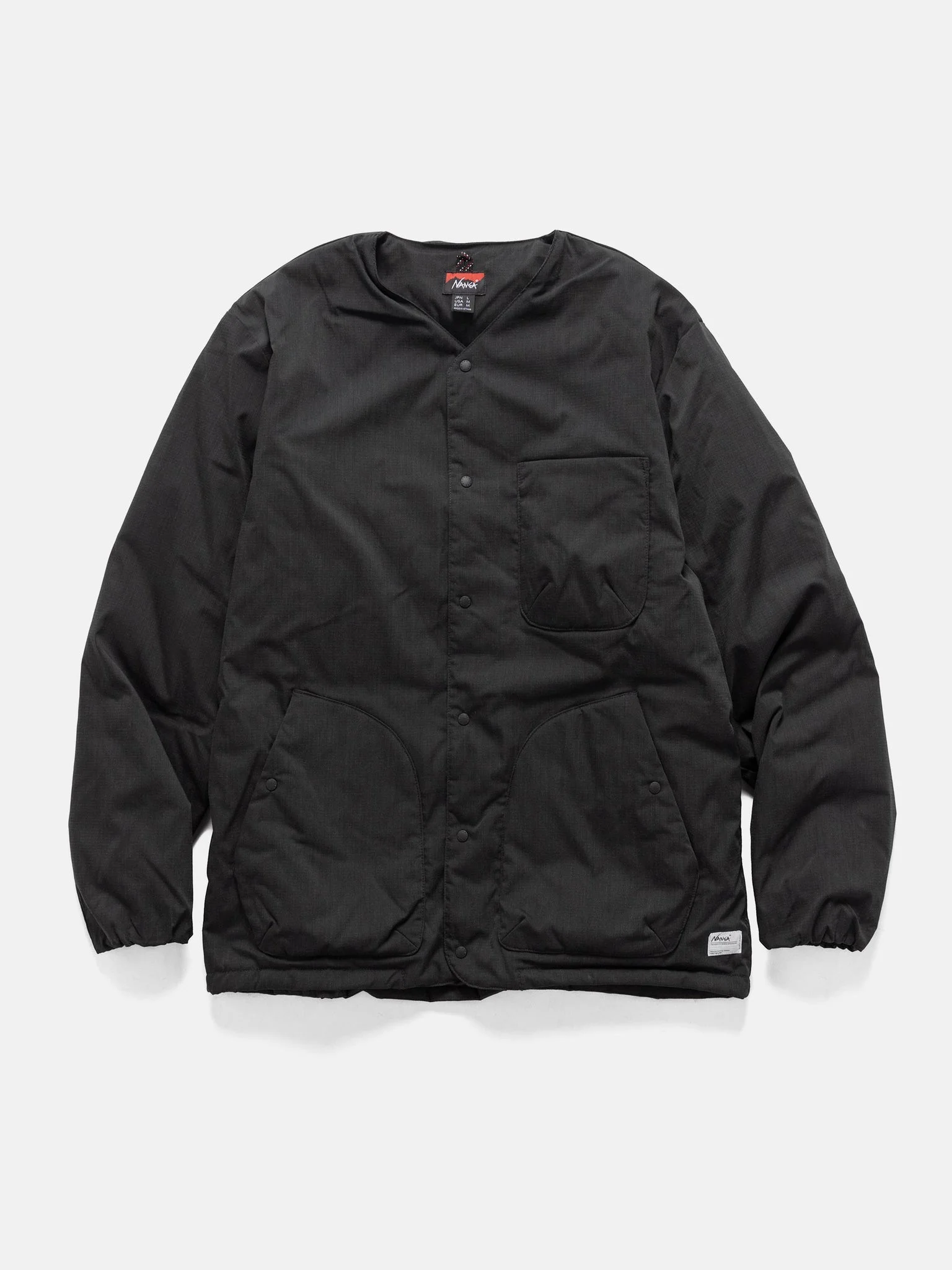 The NANGA Hinoc Ripstop Inner Down Cardigan blends technical performance with everyday versatility. Made from NANGA’s flame-retardant Hinoc ripstop fabric, it’s soft, durable, and naturally stretchy. Filled with high-quality, ultra-water-repellent UDD DX Spanish duck down, it resists moisture while keeping you warm. Lightweight and collarless, it works seamlessly as an outer layer in milder months or as a cozy insulating layer under a shell, making it a versatile wardrobe essential. DETAILS - ND2441-1M300 - Shell: 96% Polyester, 4% Aramid - Lining: 100% Nylon - Fill: 90% Down, 10% Feather - Hinoc Ripstop - NANGA's proprietary flame-retardant material - UDD DX Spanish duck down - 770 fill power - Ultra-water-repellent finish down - Regular fit - Articulated patterning - V-neck Collar - Snap front closure - Snap closure patch hand pockets - Patch chest pocket - Elasticized cuffs and hem - Embroidered label at hem - Made in Vietnam