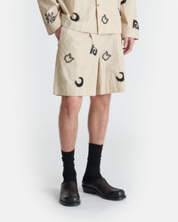 The Markos shorts are made from our striped shirting fabric and decorated with beaded Kopjafa symbols – motifs found on traditional Hungarian totem poles. They’re further distinguished by Grunge-inspired hardware at the waist. Fit Intentionally designed for an oversized look. Materials and Care Shell: 100% Cotton (Organically Grown) Do not wash, do not bleach, do not tumble dry, do not iron, dry clean any solvent except trichloroethylene. Handle with care to ensure garment lifespan. Repair or resell to support circular fashion.