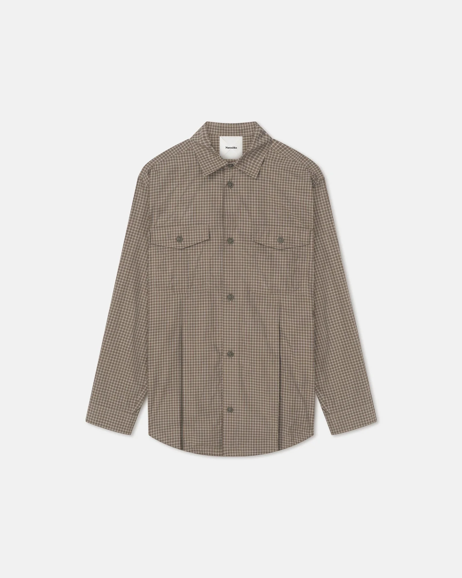 The Najib shirt feels fresh and modern thanks to the brown and creme micro check pattern and admiral pockets. The relaxed fit brings ease and elegance in equal measure. Fit Standard fit, matches usual sizing. Materials and Care Shell: 100% Cotton Machine wash warm (30°) permanent press, do not bleach, do not tumble dry, iron low heat (110°), do not dry clean Handle with care and wash less to ensure garment lifespan. Repair or resell to support circular fashion.