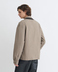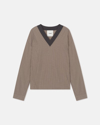 The Jahan top is inspired by classic sports aesthetics, with its contrasting V-neck, but has formal wear edge thanks to the shirting fabric and button cuffs. The brown and creme micro check is understatedly sophisticated. Fit Intentionally designed for an oversized look. Materials and Care Shell: 100% Cotton Detail: Knitted Neck Edge: 52%Viscose 46%Polyamide 2%Elastane Machine wash warm (30°) permanent press, do not bleach, do not tumble dry, iron low heat (110°), do not dry clean Handle with care and wash less to ensure garment lifespan. Repair or resell to support circular fashion.
