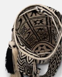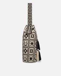 The Bucket Bag is rooted in our heritage. It is crocheted to create black and cream diamond Kopjafa motifs that are found on traditional Hungarian totems. It has a tasselled drawstring top so you can either expand or contract the elongated shape, and can be held in-hand or swung from one shoulder. Materials and Care Shell: 100% Acrylic Hand Wash, Do Not Bleach, Do Not Tumble Dry, Do Not Iron, Gentle Dry Clean Any Solvent Except Trichloroethylene Handle with care and wash less to ensure garment lifespan. Repair or resell to support circular fashion.