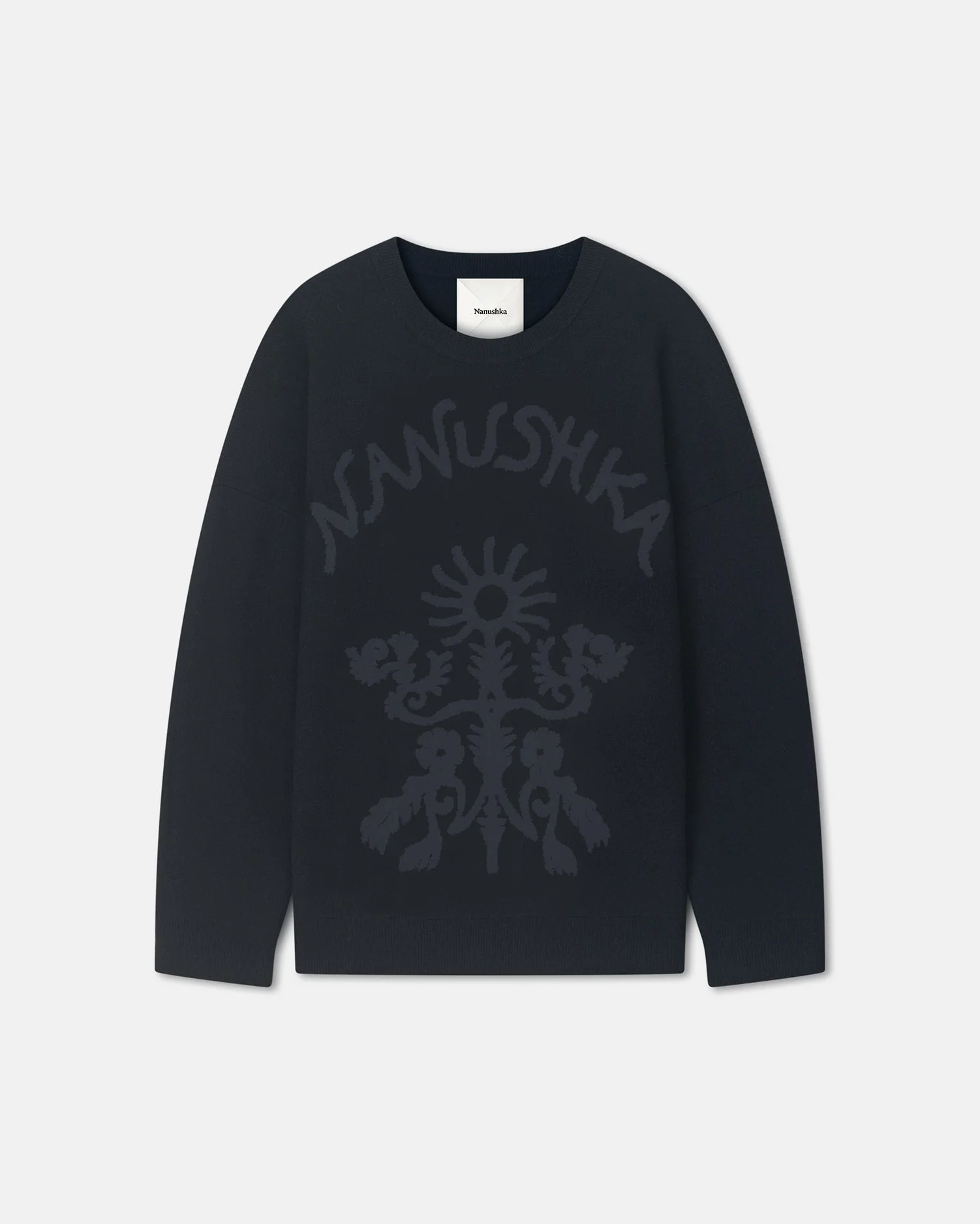 The Oswin sweater is jacquard-woven with the Nanushka logo and signature artful motifs in soft terry. It is knitted from merino wool for a louche, oversized fit. Fit Intentionally designed for an oversized look. Materials and Care Shell: Shell1 75% Cotton 25% Nylon Shell2 100% Merino Wool Hand wash cold, do not bleach, do not tumble dry, iron low heat (110°), dry clean any solvent except trichloroethylene, dry flat Handle with care and wash less to ensure garment lifespan. Repair or resell to support circular fashion.
