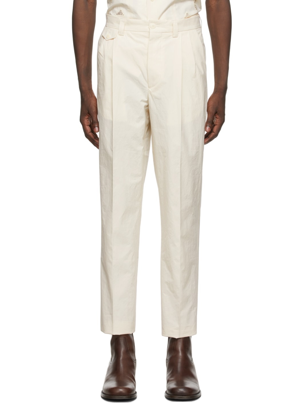 Straight-leg plain-woven slubbed cotton trousers in off-white. Pleating and darts at front. · Mid-rise · Five-pocket styling · Belt loops at waistband · Unlined · Button-fly · Corozo hardware Supplier color: Creme