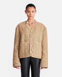 The Adara jacket shows the transformative power of fabric manipulation in elevating the essence of understated silhouettes. It has a utilitarian look and feel thanks to the snap fastenings, quilted design, capacious patch pockets and khaki tone, but is made from velvet for an unexpectedly plush, iridescent finish. The quilted texture is made up of traditional Kopjafa motifs found on Hungarian totems. Model is 175 cm (5'9'') and wears a size S Materials and Care Shell: Shell: 70% Cotton 30% Polyester. Hand Wash, Do Not Bleach, Do Not Tumble Dry, Iron Low Heat (110°), Do Not Dry Clean Handle with care and wash less to ensure garment lifespan. Repair or resell to support circular fashion.