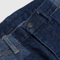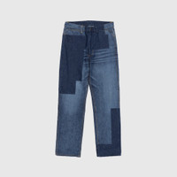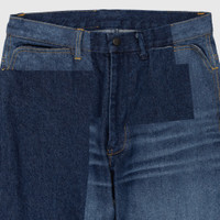 - NS171 - Indigo - 100% Cotton - 14 oz non-stretch denim - Patchwork pattern printed throughout - Zipper and button closure - Two front side pockets - Two back pockets - Contrast stitching throughout - Straight fit - Made in Japan