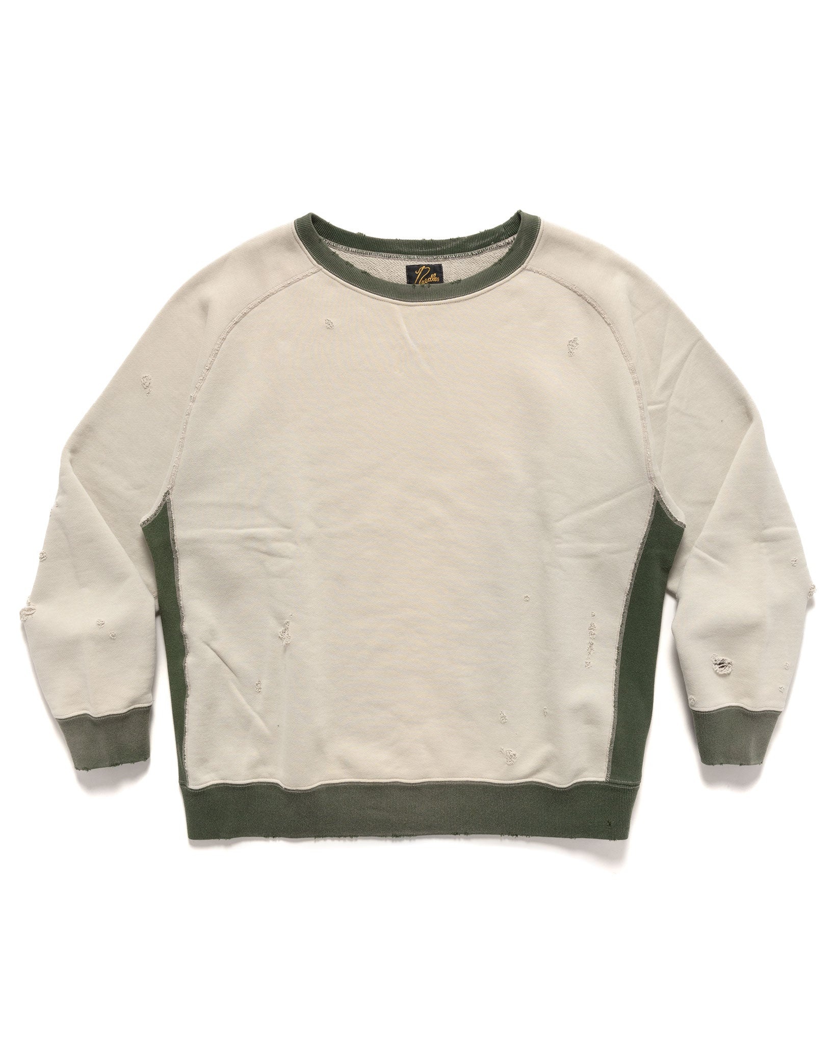 The Needles 2-Tone Crew Neck Sweat Shirt reinterprets classic sportswear with a bold two-tone construction and meticulous hand-distressing. Designed to replicate the look and feel of vintage clothing, it features realistic damage and fading treatments. Raglan sleeves and a relaxed silhouette offer a comfortable fit, while ribbed side panels and smooth four-needle flat seam stitching ensure attention to detail in both comfort and design. This artisanal piece brings a vintage aesthetic to a wardrobe staple. DETAILS - PU292 - 100% Cotton - Relaxed fit - Raglan sleeve construction - Two-tone colour blocked design - Hand distressed and fading treatment - Crewneck style - Ribbed collar, cuffs and hem - Made in Japan