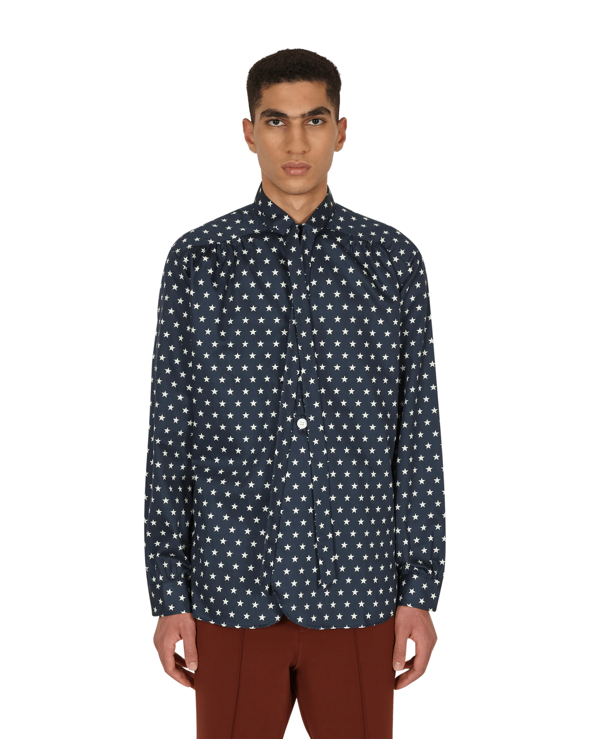 Needles Ascot Collar EDW Shirt Star B - 100% Cotton - Graphic Pattern - Ascot Collar - Half-Button Closure - Side Vents - Curved Hem - Single-Button Cuffs - Made in Japan - Style Code: JO197 B SIZE & FIT Model is 6ft 1in/1.86m with 35"/90cm chest and wears size M. Measures (Size M): 48cm Shoulders, 62cm Chest, 65cm Sleeve, 84cm Length, 60cm Hem.
