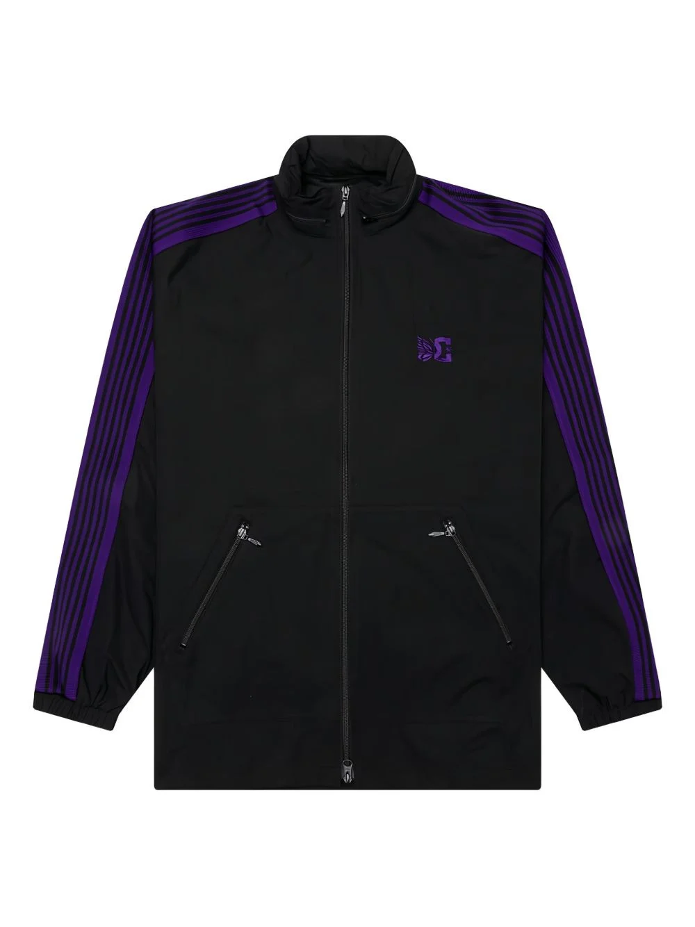 x DC Shoes stripe-detail track jacket Highlights - Black - Stripe detail - Zip fastening - Butterfly embroidery - High neck - Long sleeves Made in United States Composition Polyester 100% Washing instructions Read Manufacturer Guidelines