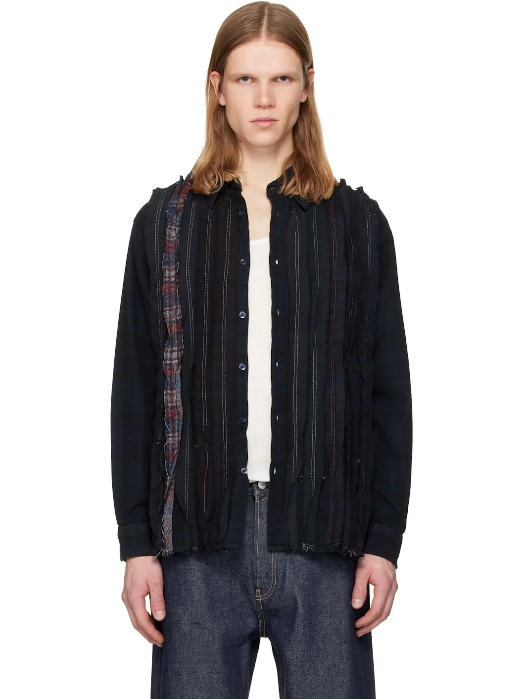 Upcycled cotton flannel shirt. · Check pattern throughout · Spread collar · Button closure · Panels with raw edges at front · Shirttail hem · Buttoned barrel cuffs · Pleats at back yoke Supplier color: Black 100% cotton. Made in Japan 251821M192006