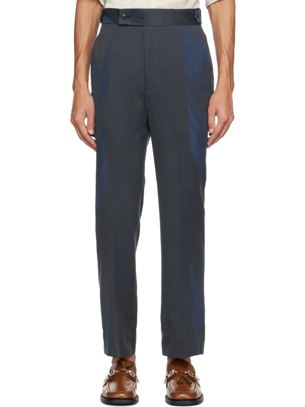 Cotton-blend twill trousers. Jacquard graphic pattern throughout. · Adjustable button tabs at partially elasticized waistband · Four-pocket styling · Zip-fly · Central crease at legs Supplier color: Blue arrow