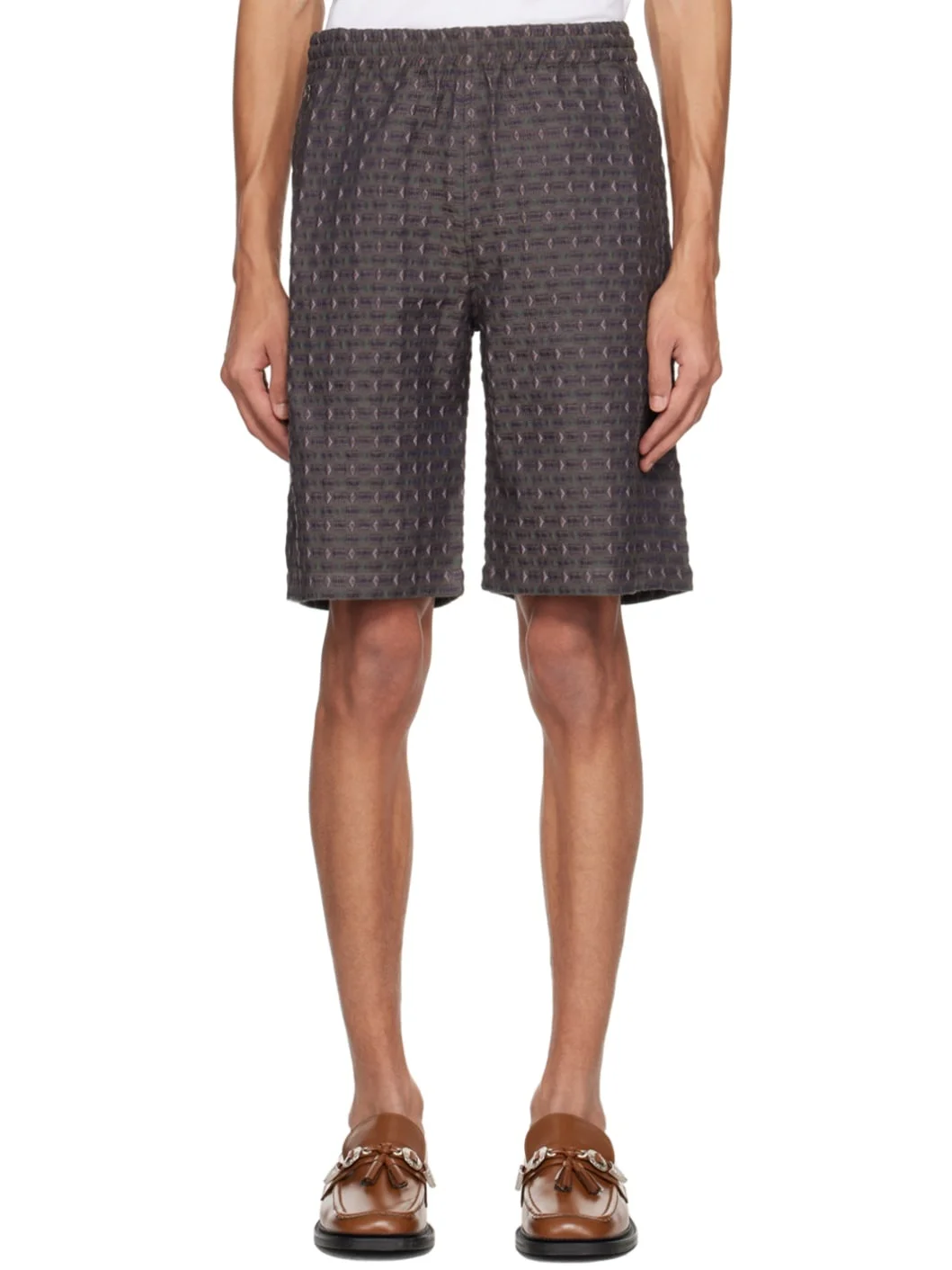 Polyester-blend dobby cloth shorts. Jacquard pattern throughout. · Concealed drawstring at elasticized waistband · Four-pocket styling Supplier color: Brown