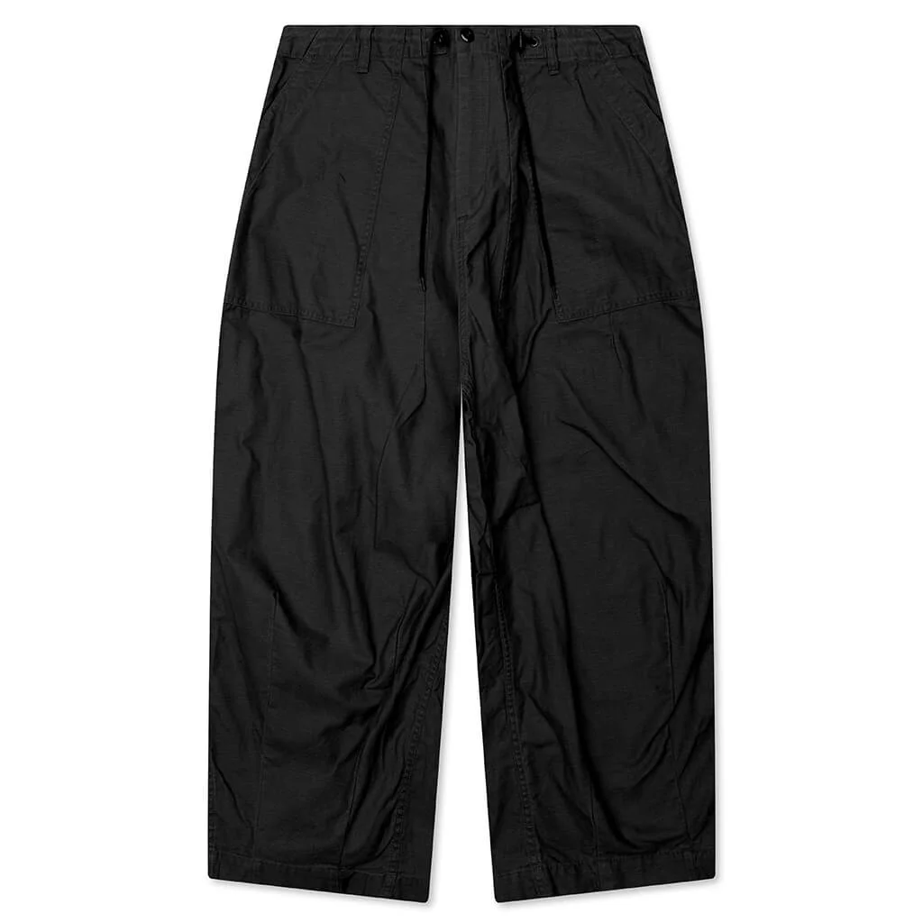 Needles continues to elevate signature silhouettes with the Fatigue H.D. Pant. The popular H.D. pants have a unique silhouette with a large puffed front due to darts at the waist and hem. The relaxed, wide silhouette allows for a comfortable fit. Technical details include the elastic drawcord waistband, zip-fly, four-pocket styling, and adjustable waist tabs. - 100% Cotton - Relaxed fit - Elastic drawcord waistband - Zip-fly with button closure - Belt loops - Adjustable waist tabs - Side-entry pockets - Back flap pockets - Style No: RW237-B-BLK