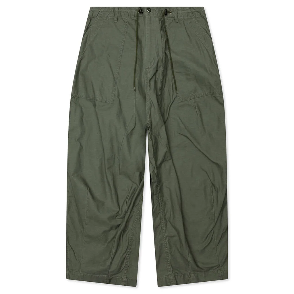 Needles continues to elevate signature silhouettes with the Fatigue H.D. Pant. The popular H.D. pants have a unique silhouette with a large puffed front due to darts at the waist and hem. The relaxed, wide silhouette allows for a comfortable fit. Technical details include the elastic drawcord waistband, zip-fly, four-pocket styling, and adjustable waist tabs. - 100% Cotton - Relaxed fit - Elastic drawcord waistband - Zip-fly with button closure - Belt loops - Adjustable waist tabs - Side-entry pockets - Back flap pockets - Style No: RW237-A-OLV