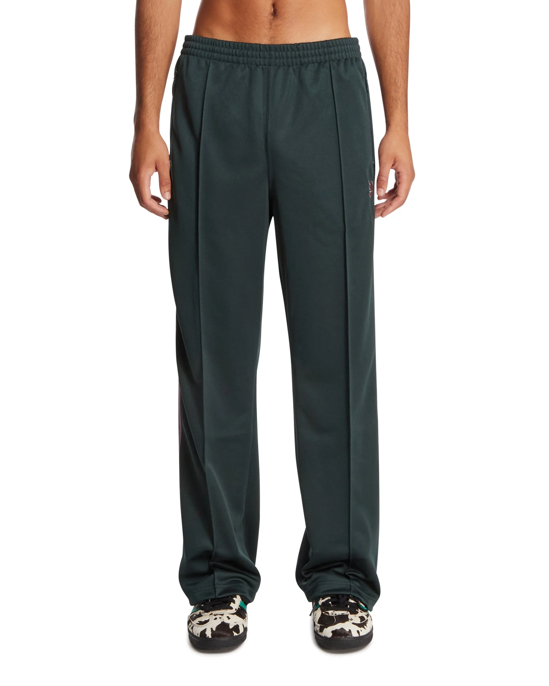 Needles Green Logo Pants. Green technical fabric, contrasting details, elastic waistband, two side zip pockets, one back zip pocket, logo detail, straight hem. Thiago is 185 cm and he is wearing size L. DETAILS Model: RW316BGREEN Composition: 100% Polyester Made in: JAPAN Season: FW25-26