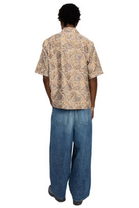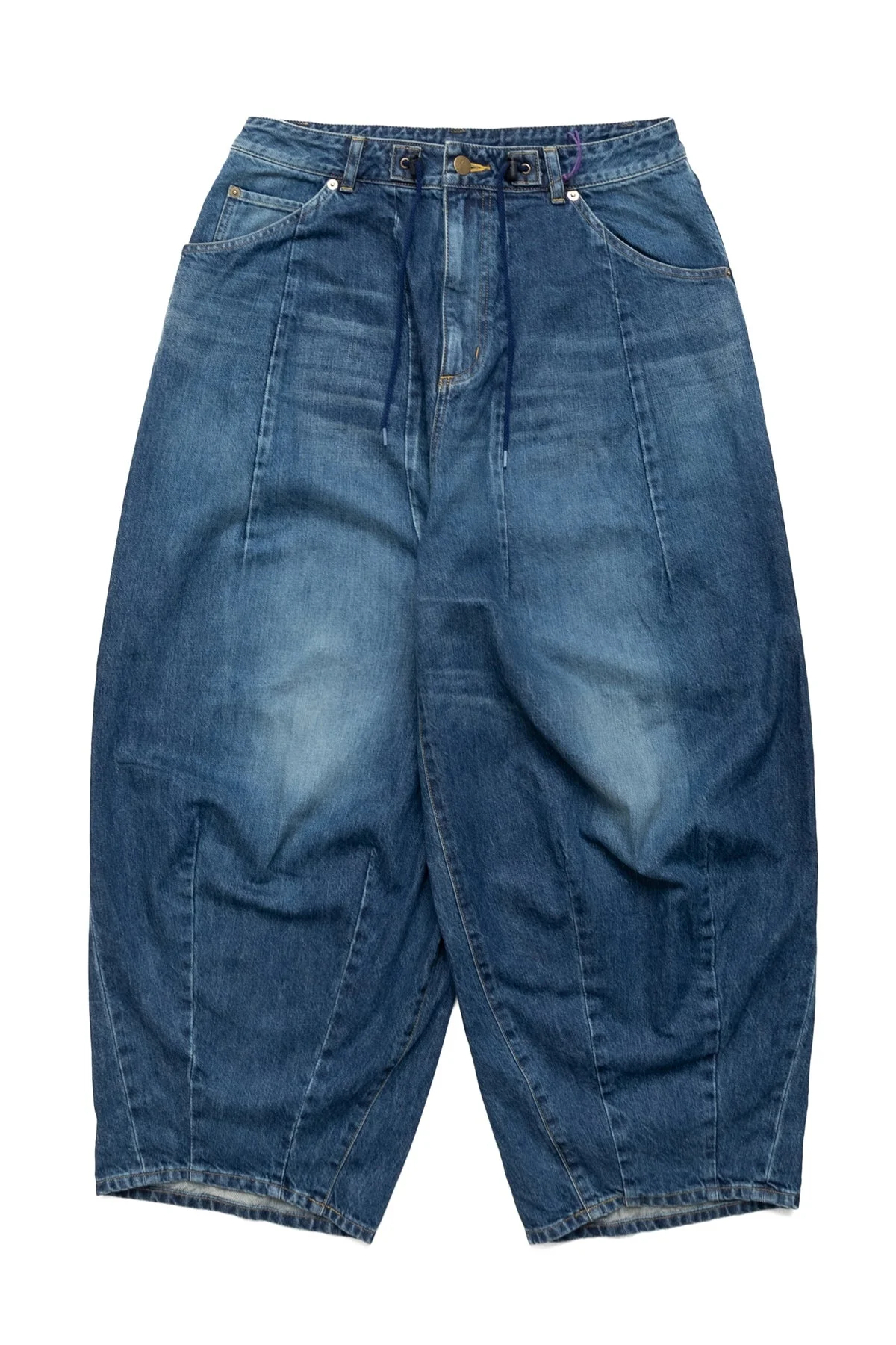 - 12oz denim - Elastic waist with strings - A unique silhouette with a large bulging front due to a unique pattern - Relaxed fit - Color: Faded Indigo - 100% cotton - Made in Japan - Model is 6'2 wearing a size S