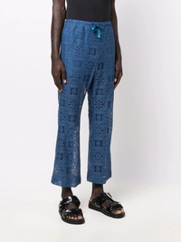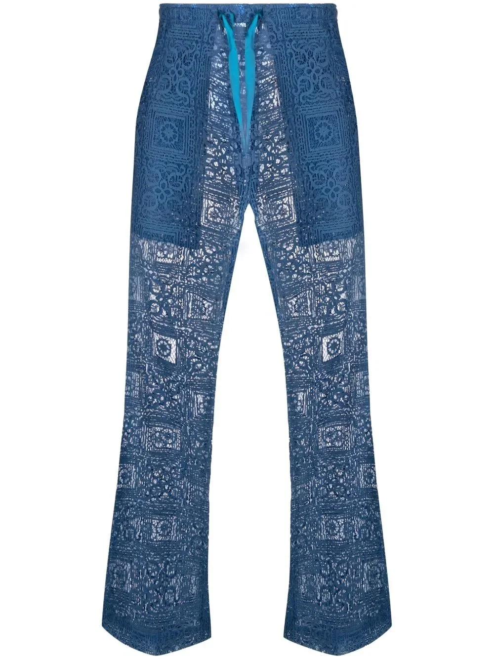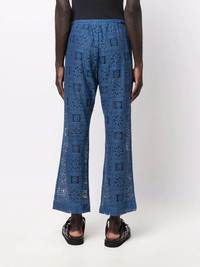 lace-detail wide leg trousers blue cotton-blend lace detailing bootcut drawstring fastening waist two side slash pockets cropped leg Imported Composition Cotton 63%, Polyester 37% SIZE & FIT Model measurements Height 6 ft 2 in(1.87 m) Bust/Chest 36.41 in(92.5 cm) Hips 37 in(94 cm) Waist 29.52 in(75 cm) FittingInformation This piece fits true to size. We recommend you get your regular size Designed for a slim fit at the waist and loose over the leg Made with a mid-weight non-stretch fabric Washing instructions Hand Wash