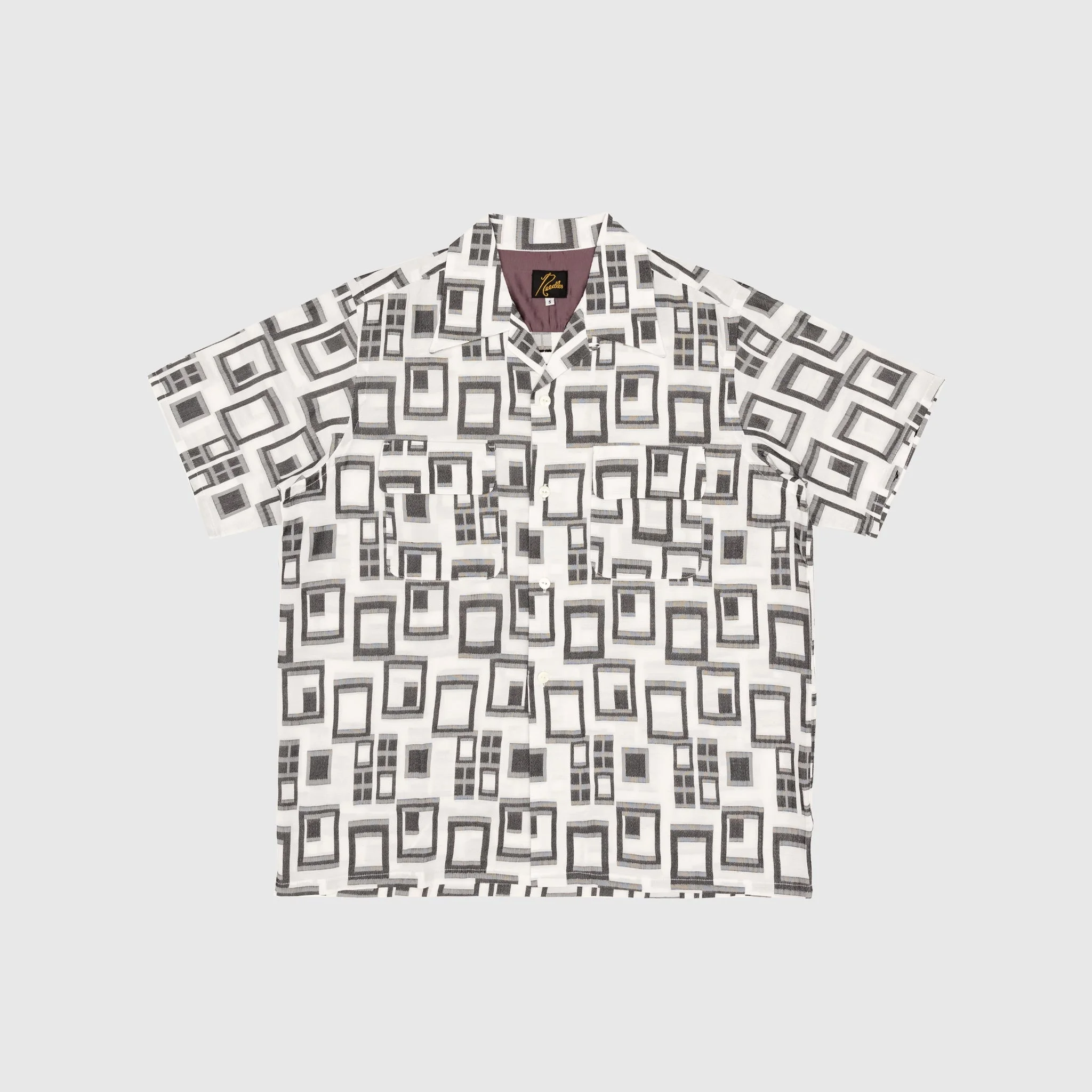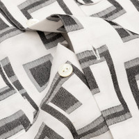 - MR127 - A-Off White A - 72% Rayon, 20% Polyester, 8% Hemp - Original jacquard material - Front button closure - Two front pockets with flap closure - Spread collar - Boxy fit - Made in Japan