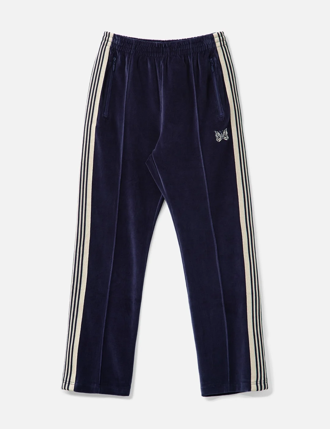 - Needles - Narrow Track Pant - Made of cotton-polyester blend jersey - Soft velvety texture - Narrow fit - Elasticated waistband with hidden drawcord - Two side YKK zip pockets - One rear YKK zip pocket - Butterfly embroidery on the left leg - Contrast striped accents on the sides - Front seam detail - Made in Japan - Color: Navy - Material: 75% Cotton, 25% Polyester - See more Pants and Clothing - Model wears size S - Model measures: Height 187cm, Chest 34”/84cm, Waist 26”/67cm, Hip 36”/88cm - Vendor Code: RW325