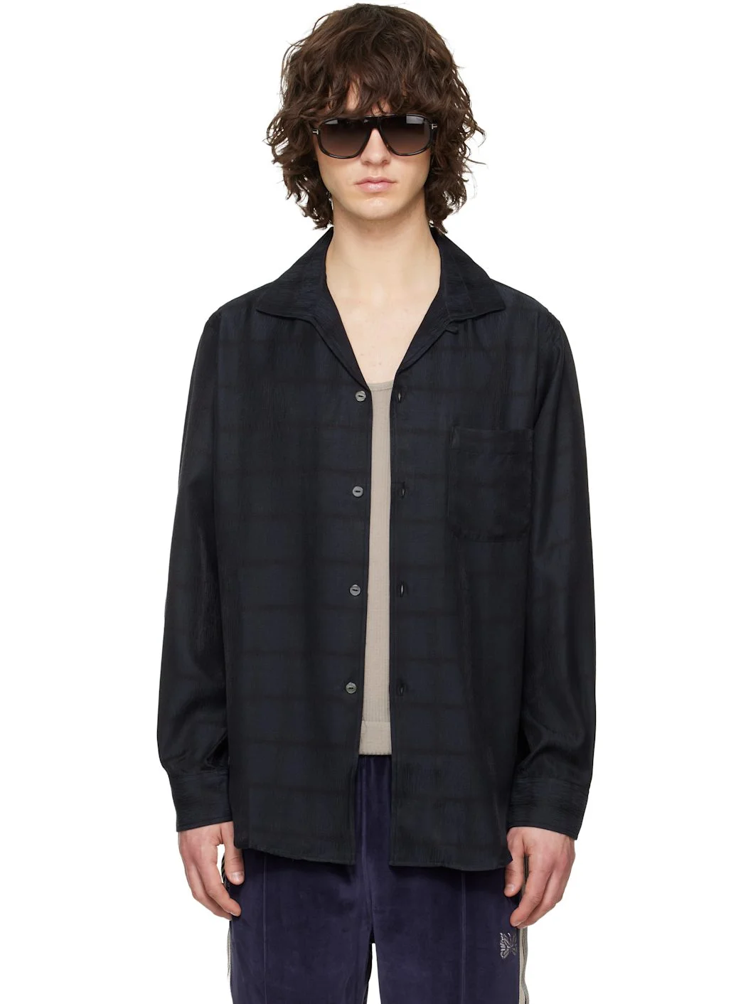 Flannel shirt. · Check pattern throughout · Open spread collar · Button closure · Patch pockets at chest · Shirttail hem · Buttoned barrel cuffs · Box pleat at back yoke Supplier color: Navy 50% rayon, 36% polyester, 14% cotton. Made in Japan 252821M192017