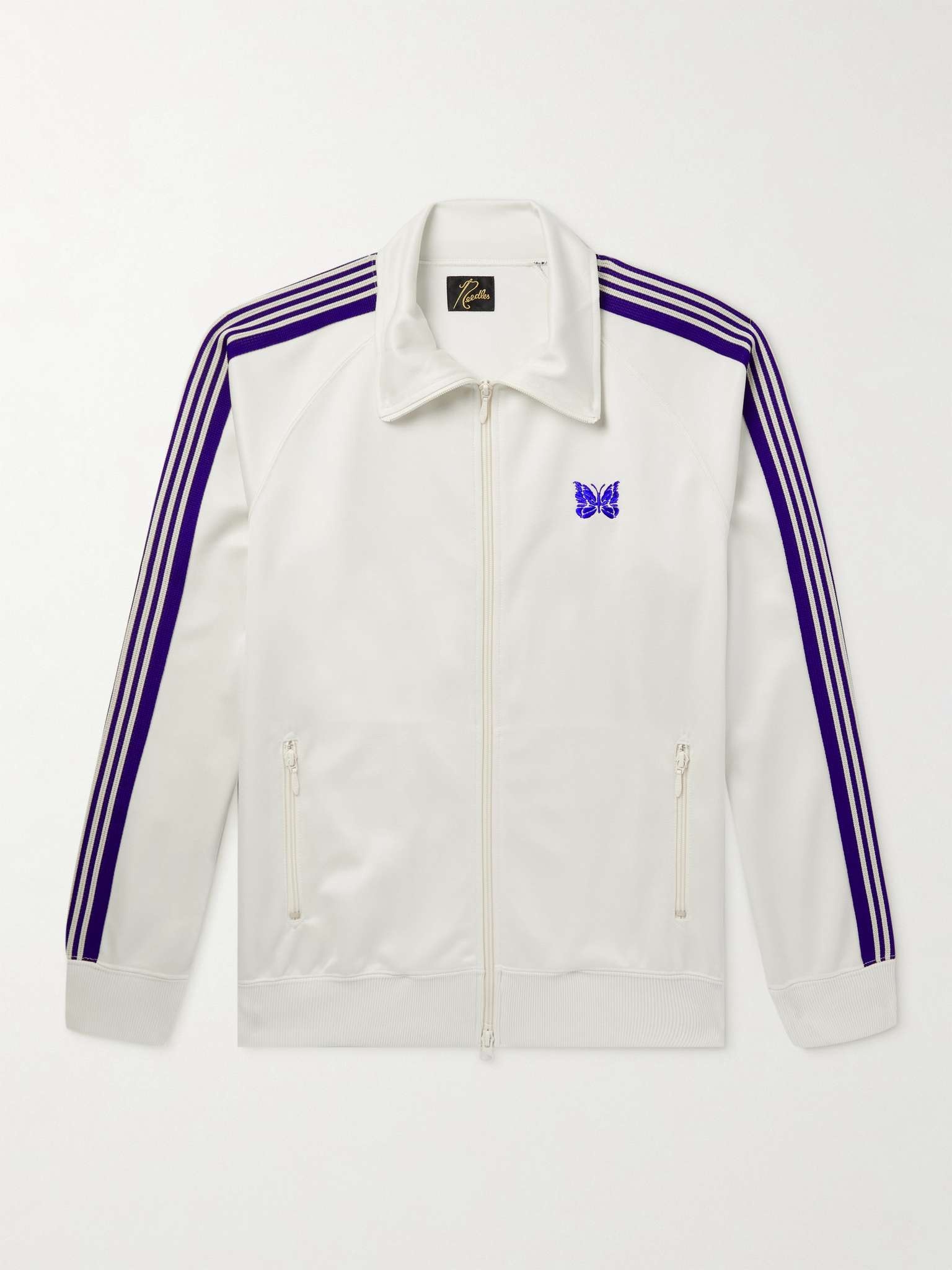 Wear Needles' 'R.C.' jacket with the matching pants and you've got the recipe for the brand's highly coveted tracksuit (A$AP Rocky and Tyga are fans). This style is cut from smooth jersey with contrasting webbing stripes and the label's signature butterfly emblem. Small to size. See Size & Fit notes. Size & Fit - Fits small to size. Take one size larger than normal - Designed for a regular fit - Mid-weight, slightly stretchy fabric - Model is shown wearing a M - Model measures: chest 36"/ 92cm, height 6'1"/ 185cm Details & Care - Cream jersey - Two-way zip fastening - 100% polyester; rib: 100% polyester - Machine wash - Made in Japan