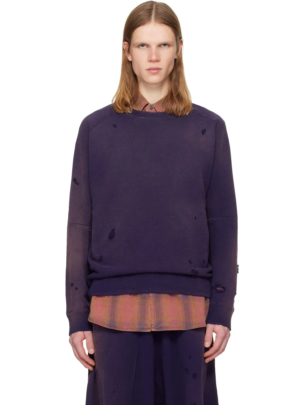 French terry sweatshirt. · Fading and distressing throughout · Rib-knit crewneck, hem, side seams, and cuffs · Darts at raglan sleeves Supplier color: Purple Body: 100% cotton. Trim: 100% cotton. Made in Japan 251821M204002