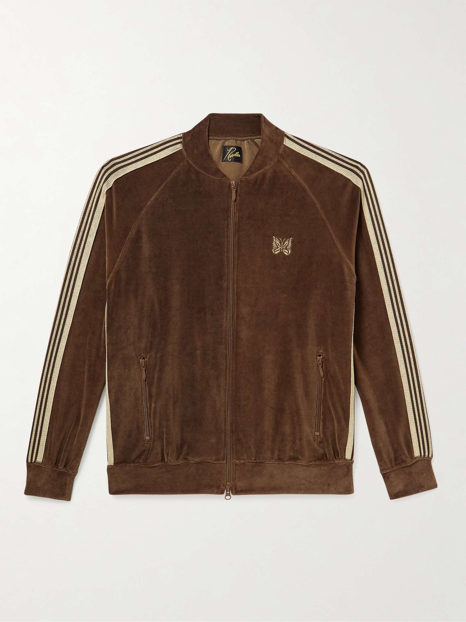 Launched in Japan in 1997, Needles' popularity blew up in 2017 when A$AP Rocky wore the brand's glittery tracksuit bottoms. This track jacket is made from plush cotton-blend velour and trimmed with sporty webbing stripes down both sleeves. Don't miss the signature butterfly at the chest. Size & Fit - Those with broad shoulders may wish to take the next size up - Mid-weight, slightly stretchy fabric - Model is shown wearing a M - Model measures: chest 36"/ 92cm, height 6'0"/ 183cm Details & Care - Brown cotton-blend velour - Zip fastening - 77% cotton, 23% polyester; trim1: 100% polyester; trim2: 100% rayon - Hand wash - Made in Japan