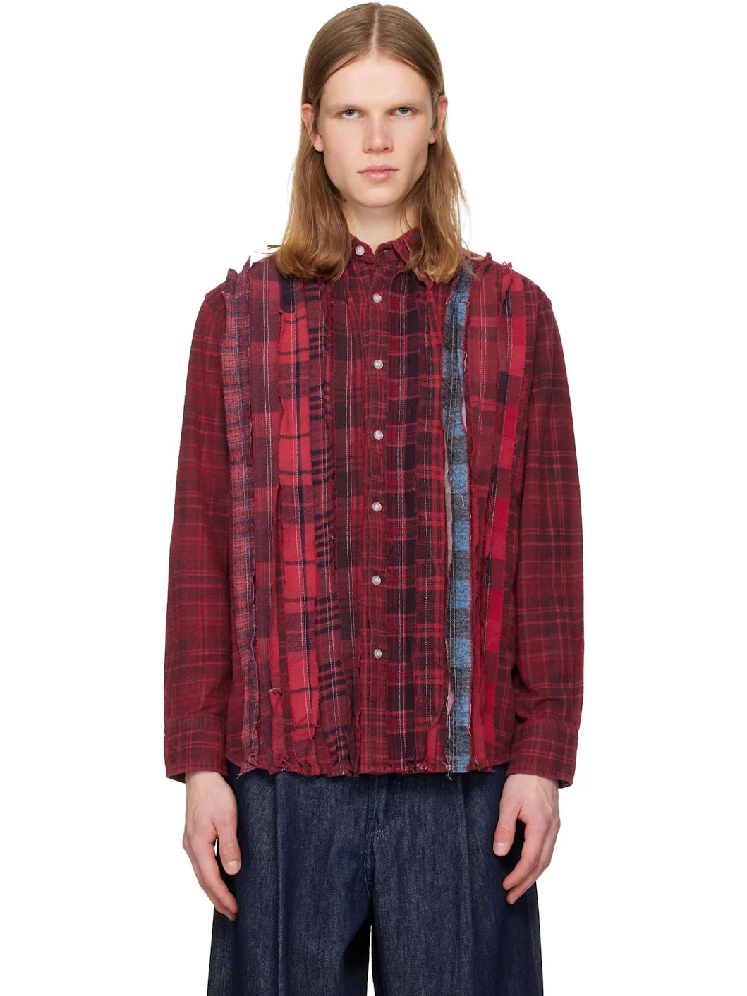 Upcycled cotton flannel shirt. · Check pattern throughout · Spread collar · Button closure · Panels with raw edges at front · Shirttail hem · Buttoned barrel cuffs · Inverted box pleat at back yoke Supplier color: Red 100% cotton. Made in Japan 251821M192008
