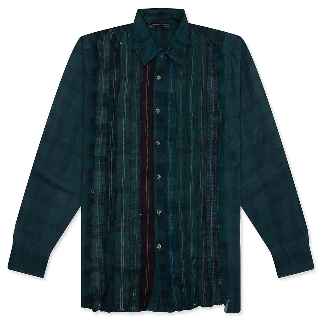 The Needles Ribbon Wide Over Dye Flannel Shirt is a must-have apparel silhouette for any collection. The design is made from an assortment of vintage flannels stitched together to create multiple ribbon cuts, a signature for the brand. Each garment is unique and will feature various cuts and patterns. The eclectic design is composed entirely of cotton and features a button-down closure and classic collar. To complete the shirt, the flannel has been over-dyed in multiple colors to give it a distinctive final look. - 100% Cotton - Wide fit - One-of-one - Reworked design - Flannel fabric - Classic collar - Button-down closure - Over-dyed pigment - Style No: RW397-B-DGRN