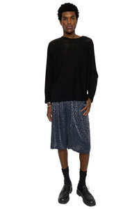- These shorts are a shorter version of the classic H.D. pants, featuring darts at the waist and hem for a wide, balloon-like silhouette. - Waistband with strings - Snap buttons reminiscent of Western wear - The supple, lustrous rayon complements the leopard print in a jacquard weave. - Relaxed fit - Color: Navy - 80% rayon, 20% nylon - Made in Japan - Model is 6'2 wearing a size M
