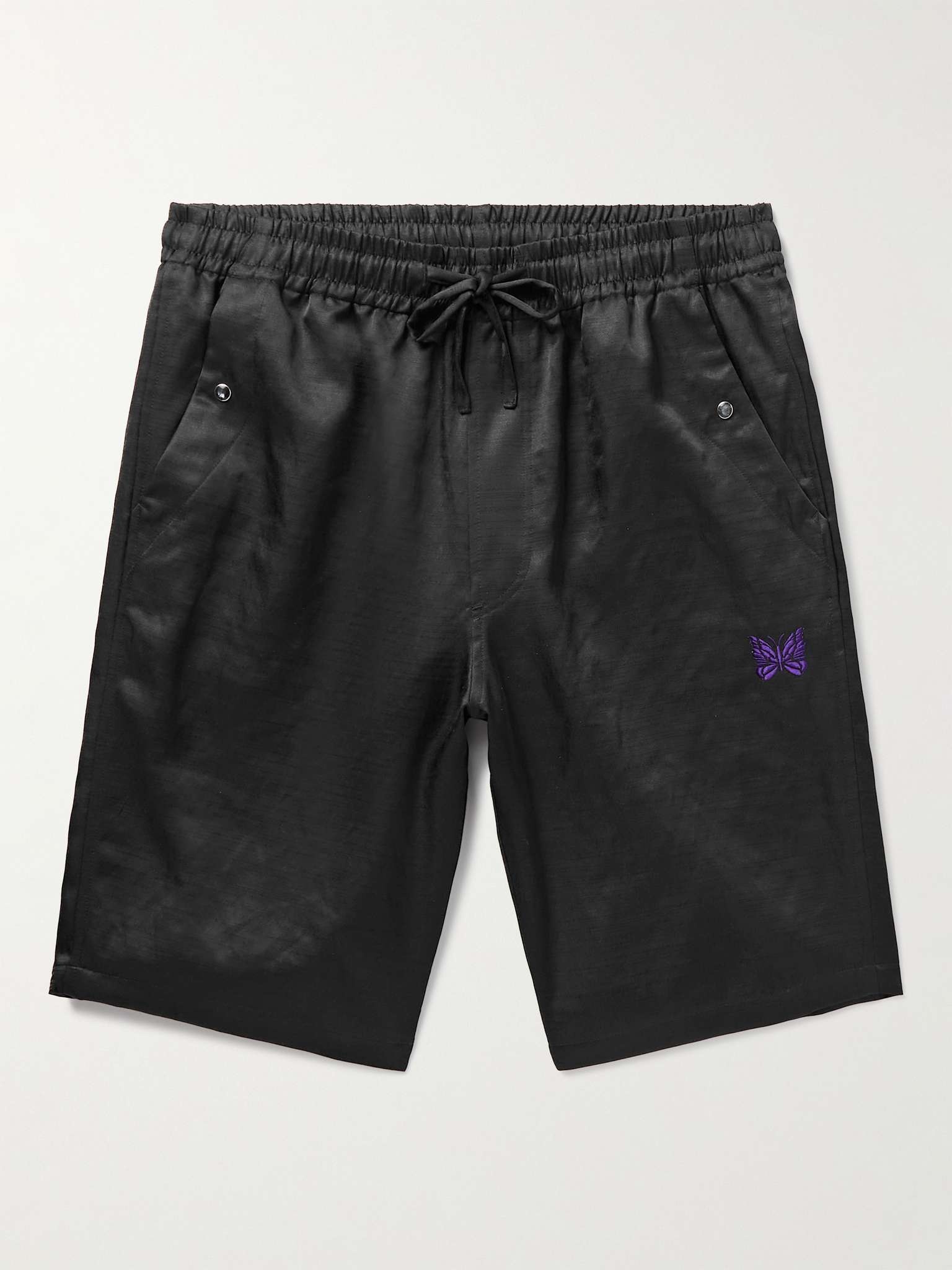 Needles' 'String Cowboy' shorts have been made in Japan from lustrous sateen and embroidered with a signature butterfly logo. They have a comfortable elasticated drawstring waistband and pearlescent snap fastenings along the pockets. Size & Fit - Fits true to size. Take your normal size - Relaxed-straight leg, low-crotch style - Adjustable at the waist - Mid-weight, non-stretchy fabric - Model is shown wearing a S - Model measures: waist size 30, height 6'1"/ 185cm Details & Care - Black sateen - 100% polyester - Hand wash - Made in Japan