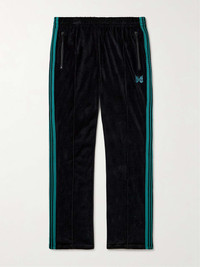 Needles' best-selling track pants can be worn with or without the matching jacket. They've been made in Japan from soft cotton-blend velour and embroidered with the brand's butterfly inspired by Steve McQueen's tattoo from the film Papillon. Size & Fit - Model wears a size larger to achieve a looser fit - Relaxed-straight leg, mid-rise style - Elasticated at the waist - Mid-weight, slightly stretchy fabric - Model is shown wearing a M - Model measures: waist size 30, height 6'0"/ 183cm Details & Care - Black cotton-blend velour, blue and black webbing - 80% cotton, 20% polyester; trim1: 100% polyester; trim2: 100% rayon - Hand wash