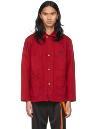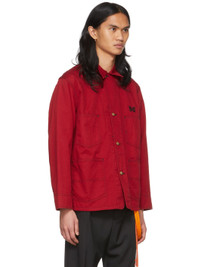 Long sleeve cotton twill shirt in red. Logo embroidered in black at chest. · Spread collar · Button closure at front · Patch pockets at chest and waist · Adjustable single-button barrel cuffs · Contrast stitching in black Part of the Needles x Smith's collaboration. Supplier color: Red Body: 100% cotton. Trim: 100% rayon.