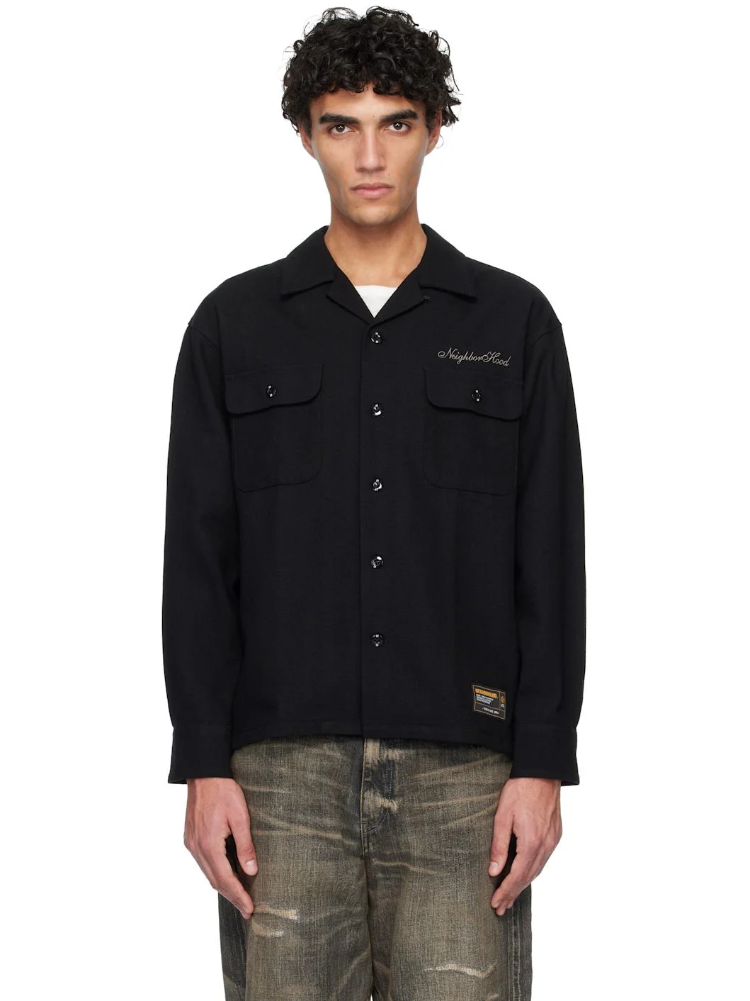 Cotton- and wool-blend herringbone shirt. · Open spread collar · Button closure · Logo embroidered at chest · Flap pockets at chest · Logo patch at front hem · Logo flag at side seam · Barrel cuffs · Pleats at back yoke Supplier color: Black 40% cotton, 40% wool, 15% polyester, 5% others. Made in Japan 261019M192000