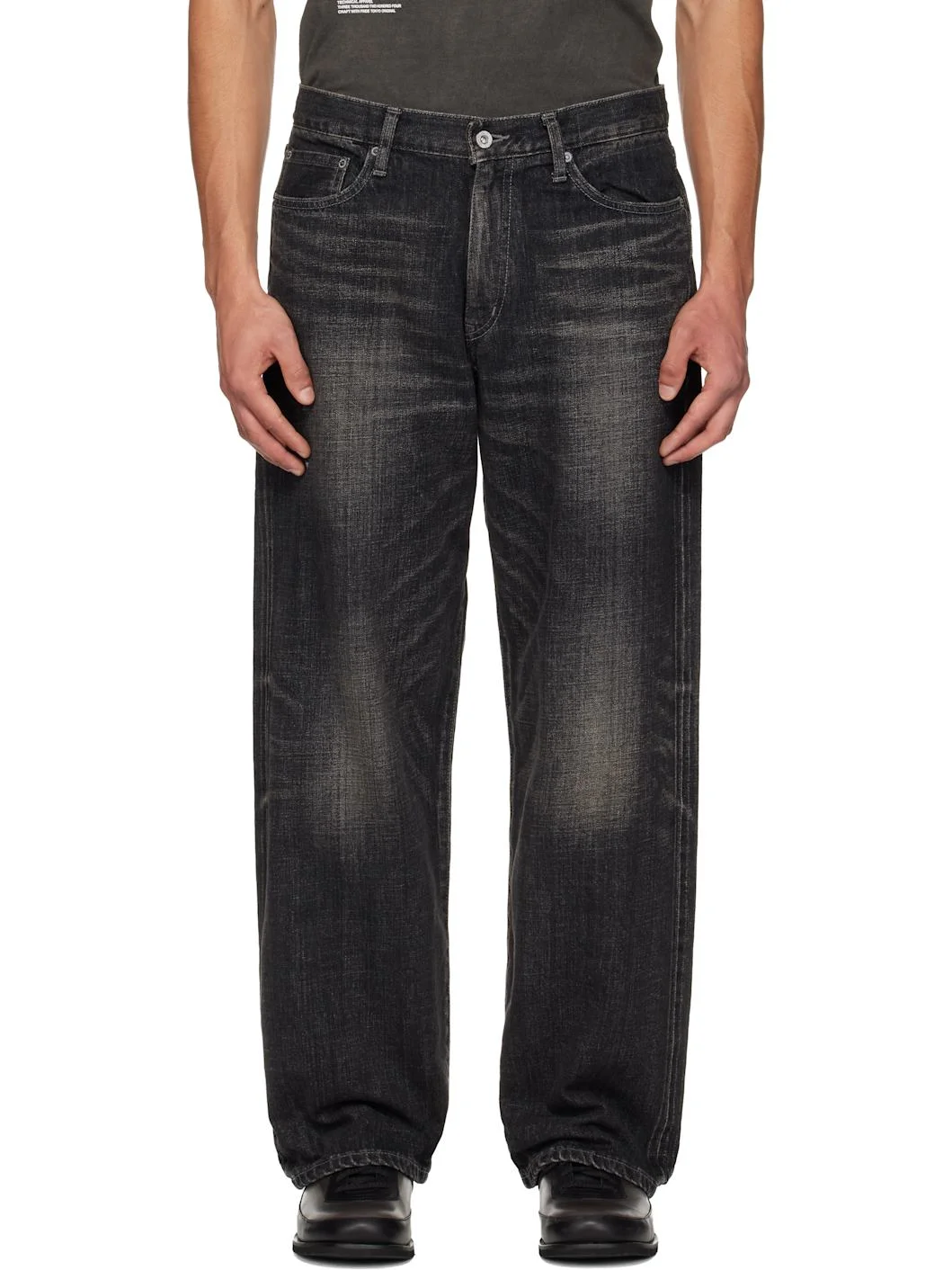 Non-stretch selvedge denim jeans. · Fading and subtle distressing throughout · Belt loops · Five-pocket styling · Zip fly · Logo patches at back waistband · Topstitched logo at back pockets Supplier color: Black 100% cotton. Made in Japan 252019M186006
