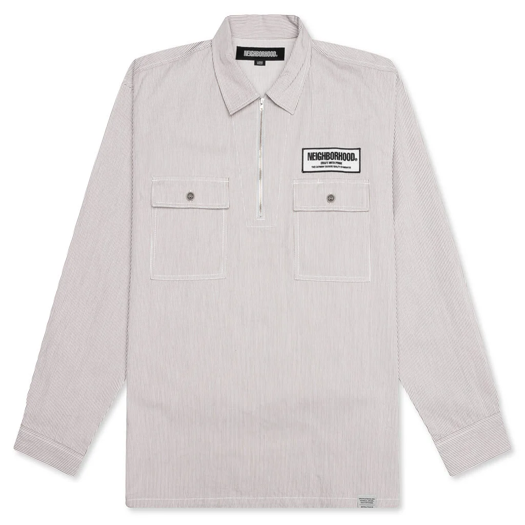 Neighborhood presents clean style with the Classic Work L/S Pullover Shirt. Constructed from cotton, the piece is adorned in a hickory stripe pattern. The point collar and half-zip closure provide a contemporary twist, while two chest pockets and a pen holder offer practical storage. Signature branded details include a logo patch, woven tag, and custom buttons. - 100% Cotton - Point collar - Half-zip closure - Chest pockets - Pen holder - Logo patch - Woven brand tag - Custom buttons - Style No: 252TSNH-SHM11-BEI