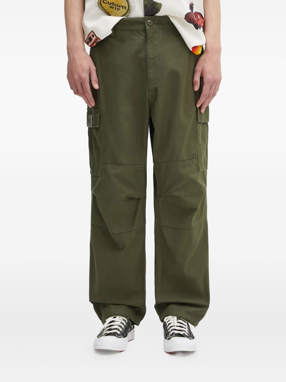 cotton-blend cargo trousers Highlights - Olive green - Button and zip front fastening - Multiple cargo pockets - Straight leg - Rear flap pockets - Rear slit pockets Imported Composition Cotton 80%, Nylon 20% Washing instructions Read Manufacturer Guidelines