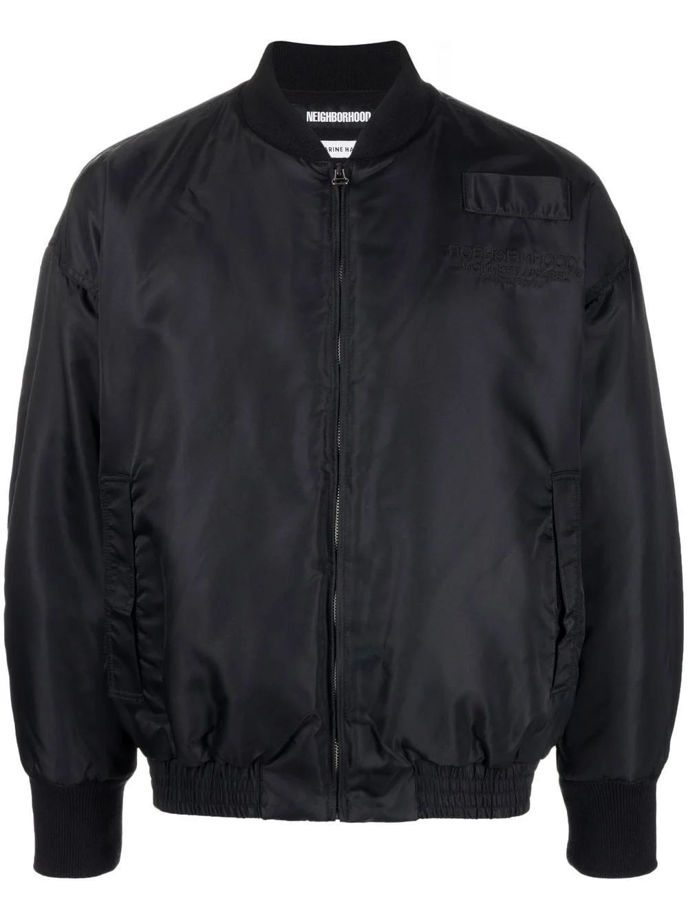 embroidered zip-up bomber jacket black embroidered logo band collar front zip fastening long sleeves fitted-cuff sleeves two side slit pockets elasticated hem Imported Composition Outer: Nylon 100% Lining: Polyester 100% Filling: Polyester 100% SIZE & FIT Model measurements Height 6 ft 2 in(1.88 m) Bust/Chest 31.88 in(81 cm) Hips 35.82 in(91 cm) Waist 27.55 in(70 cm) FittingInformation This piece fits true to size. We recommend you get your regular size Cut for an oversized fit Made with a mid-weight fabric Washing instructions Dry Clean Only