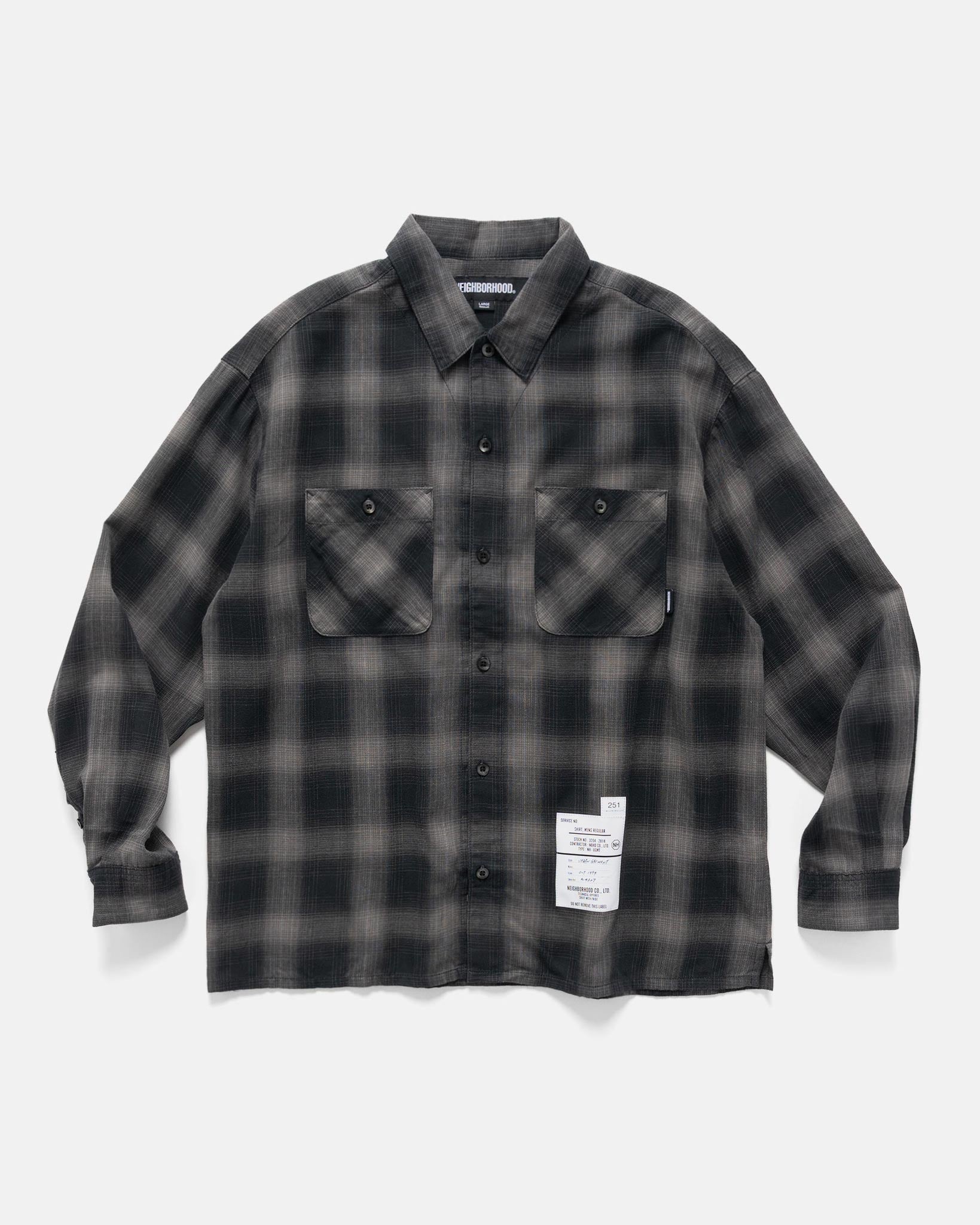 This ombre check shirt from NEIGHBORHOOD offers a soft, brushed feel with a broken-in look from the first wear. Its custom-dyed cotton fabric is designed to age over time, adding depth to its already subtle palette. With a relaxed fit and classic detailing, it layers easily over a tee in transitional weather or stands alone for casual everyday wear. DETAILS - 251ARNH-SHM01 - 100% cotton - Brushed finish - One-washed - Standard collar - Button front closure - Back yoke construction - Button chest patch pockets - Button cuffs - Straight hem with side splits - Clip tag on chest pocket seam - Brand label at hem - Made in Japan