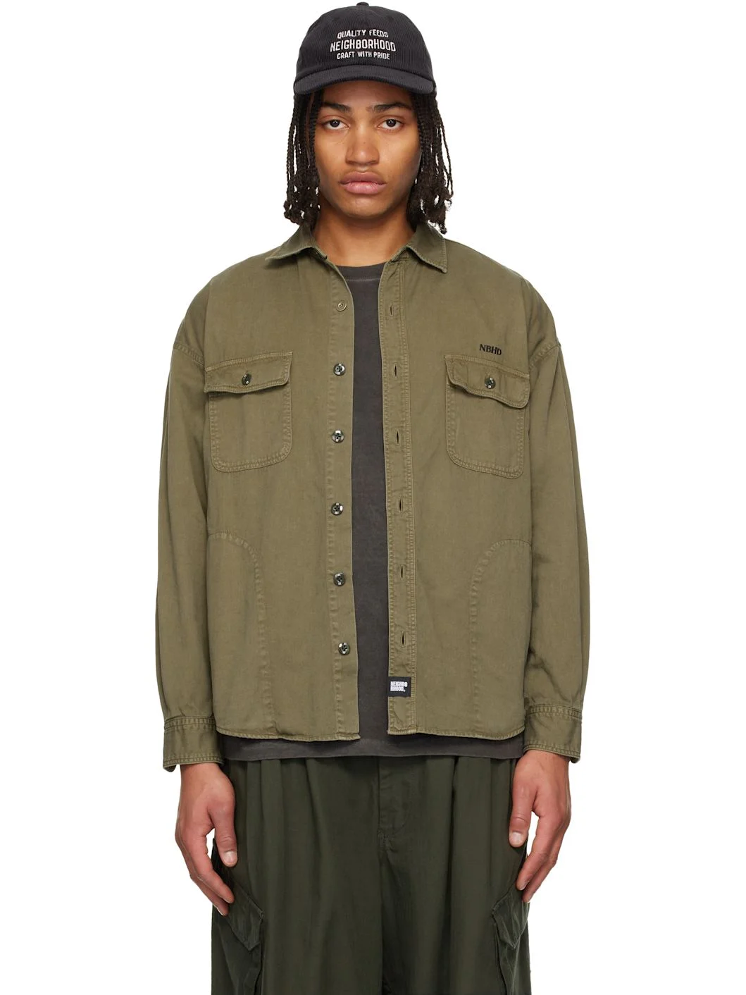 Cotton twill shirt. · Spread collar · Button closure · Embroidered logo at chest · Flap pockets at chest · Patch pockets at waist · Logo flag at side-seam · Logo patch at hem · Shirttail hem · Buttoned barrel cuffs Supplier color: Olive Drab 100% cotton. Made in Japan 261019M192001
