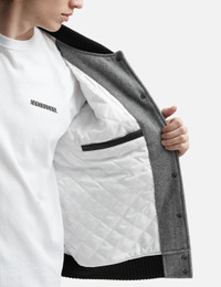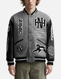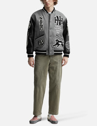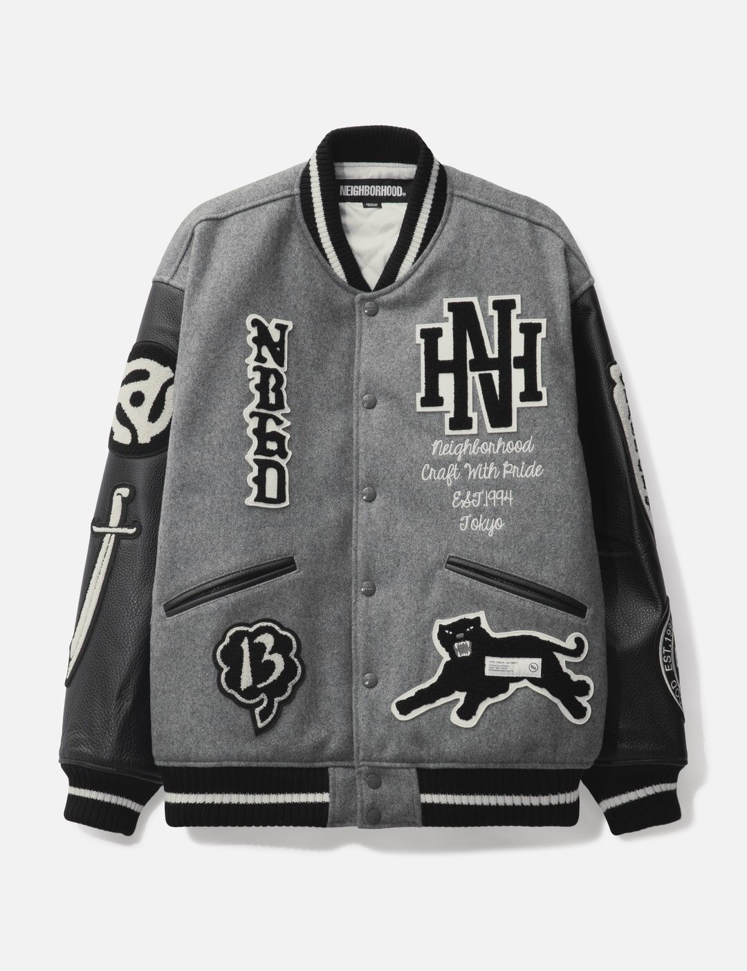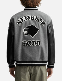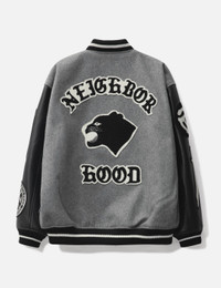- NEIGHBORHOOD - Stadium Jacket - Melton wool-blend jacket with leather sleeves - Embroidered patches - Snap button closure - Ribbed collar, cuffs, and hem - Two front pockets - Color: Gray - Material: 90% Wool, 10% Nylon; 100% Cow Leather - See more Jackets and Clothing SIZING - Model wears size M - Model measures: Height 187cm, Chest 37”/96.5cm, Waist 30”/76.2cm, Hip 37”/94cm