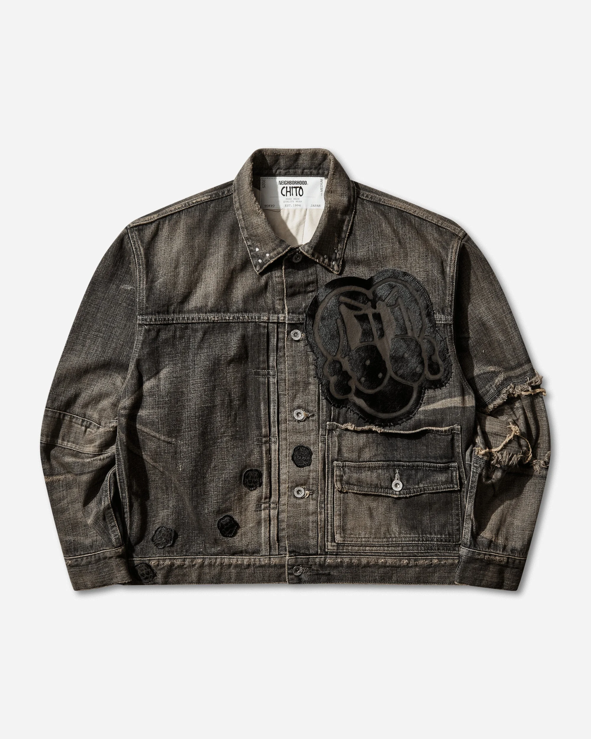Neighborhood x CHITO Savage Denim Type-1 Jacket MOD Black Made in collaboration with CHITO, this Savage denim jacket features Finesse Pup and is crafted from original 12oz selvedge denim. Finesse Pup are expressed through cowhide patches placed in multiple locations, and distressing with rework stitching across the entire back panel. Features diverse details including hand embroidery at the collar using reflector thread, paneled sleeves, and double-layered patch pockets. - 100% Cotton - 12oz Denim Fabric - Regular Fit - Classic Collar - Button Closure - Finesse Pup Cowhide Patch - Distressed Details - One Chest Pocket - Adjustable Cuffs and Hem - Made in Japan - Style Code: 252XBCIN-JKM01S BLACK
